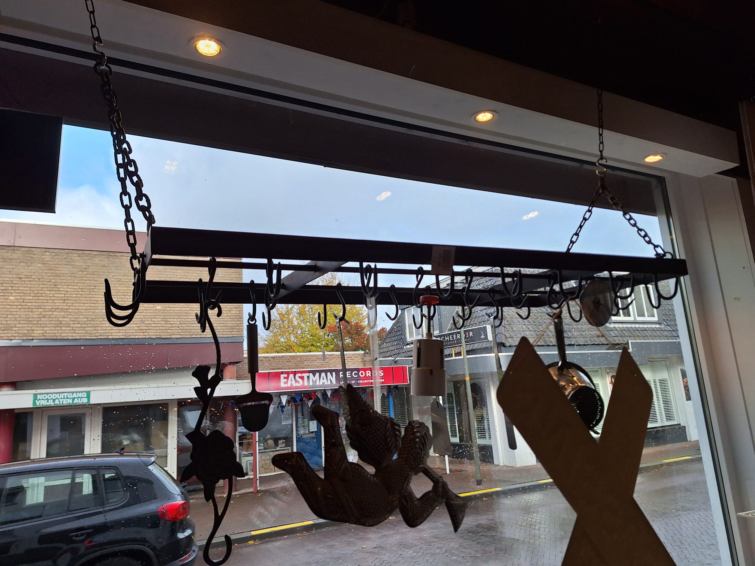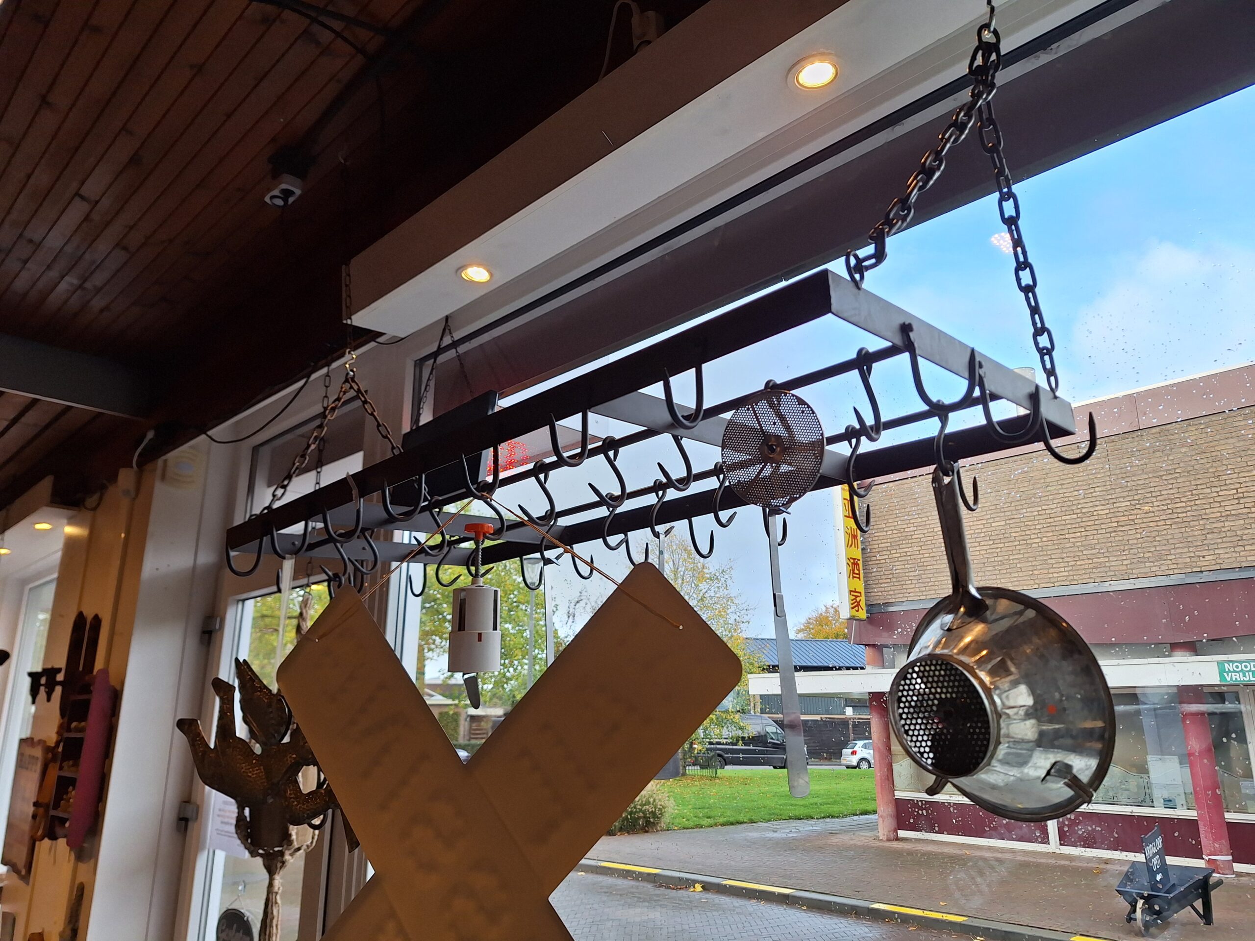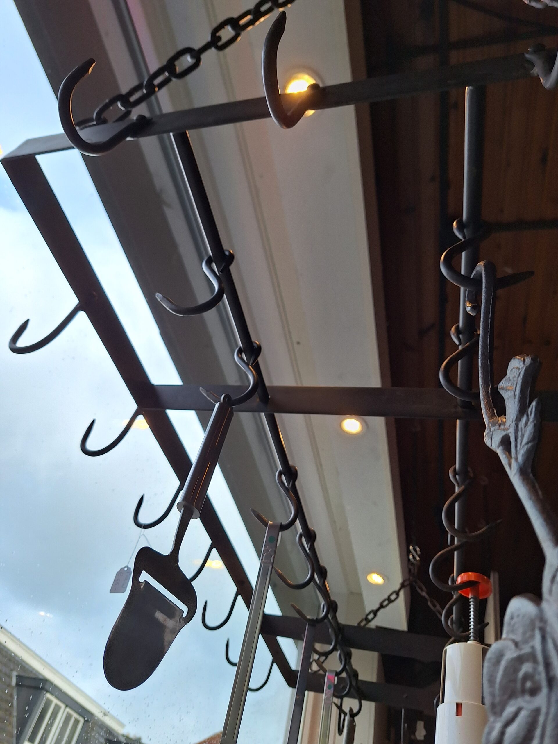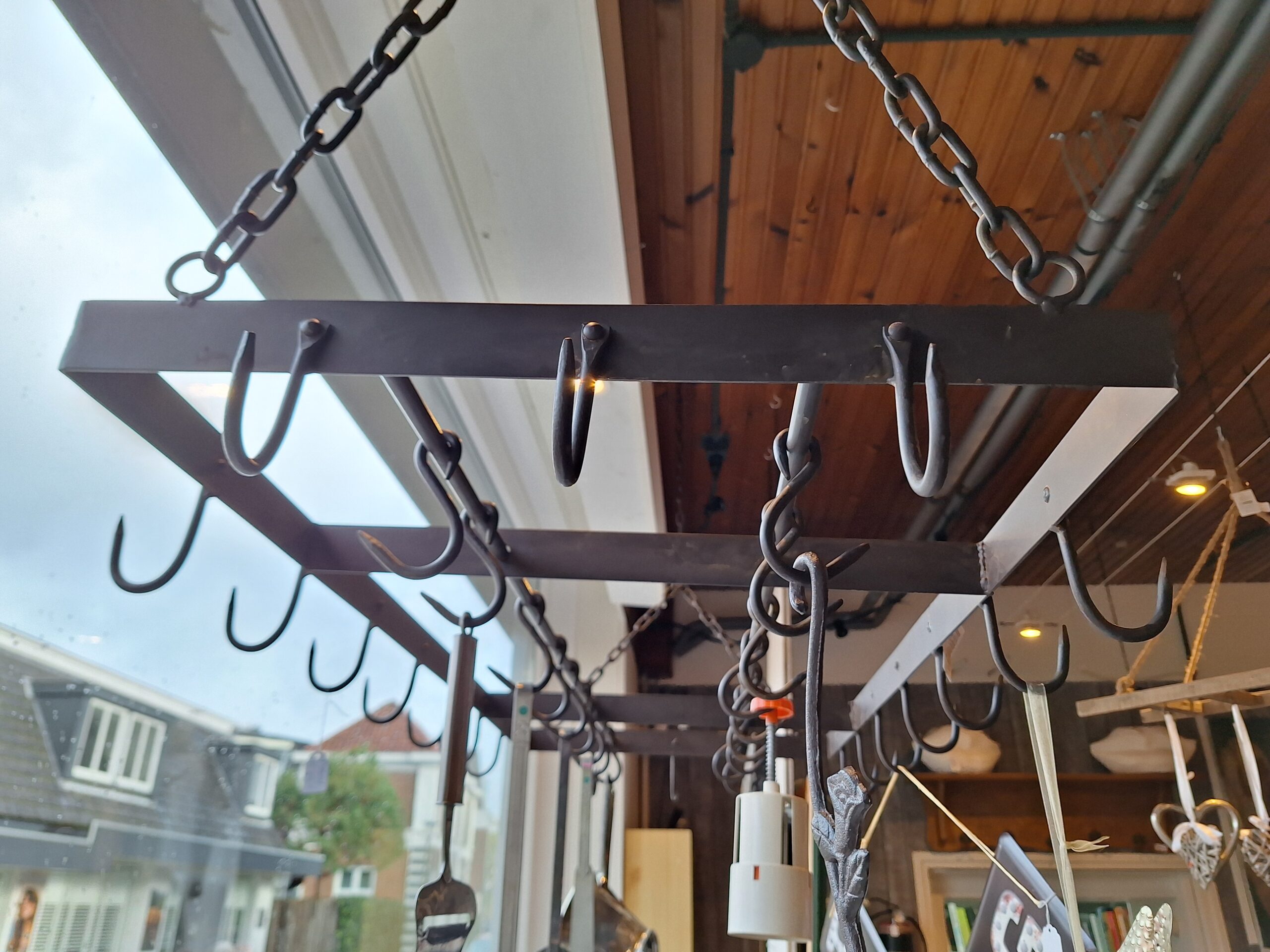 Prachtig metalen potten en pannen rek met veel (verstelbare) haken. Hij is nieuw uit de doos, 2 stuks beschikbaar. Afmetingen 44 h 62 d 130 b. Prijs € 95,-