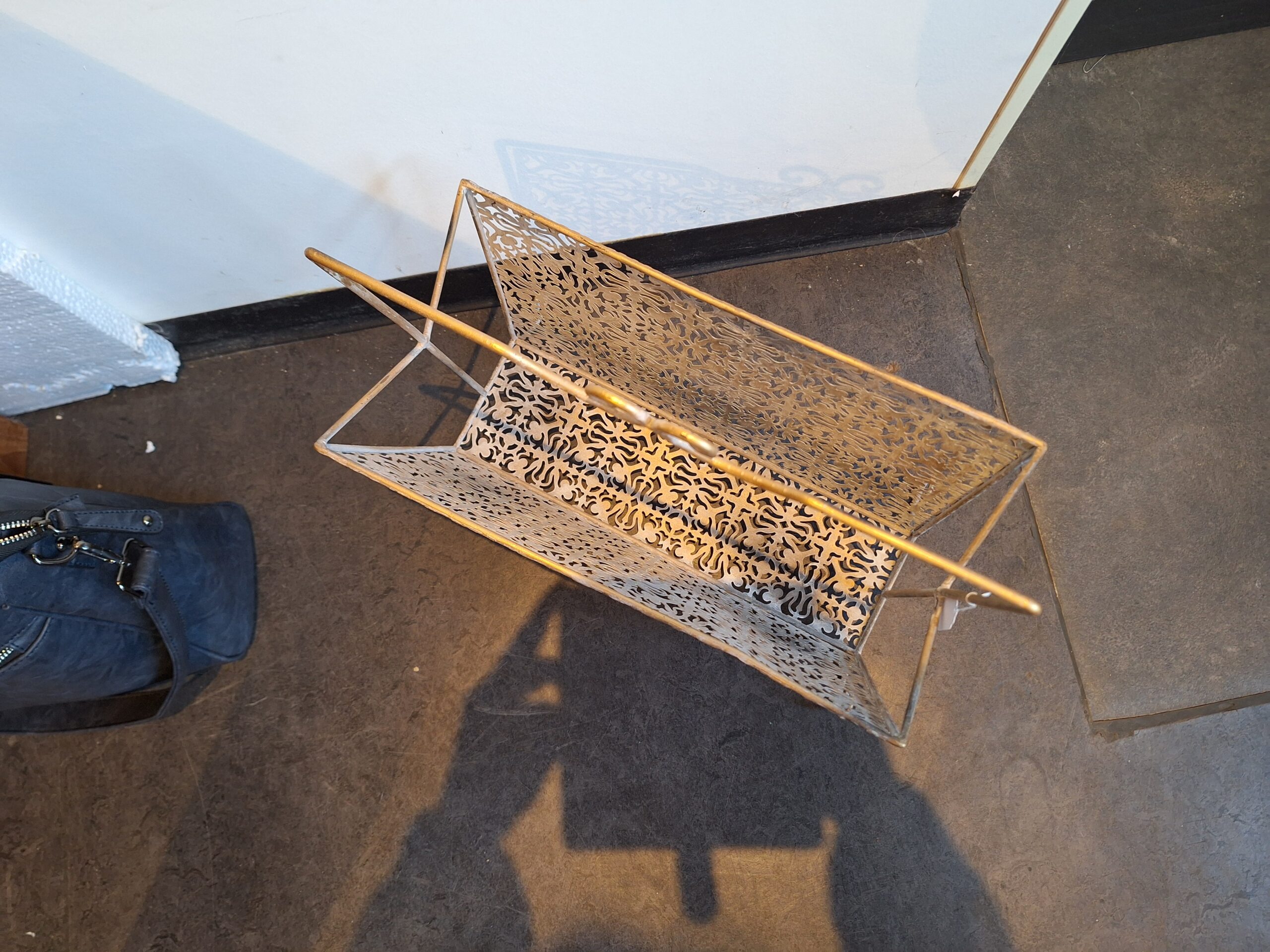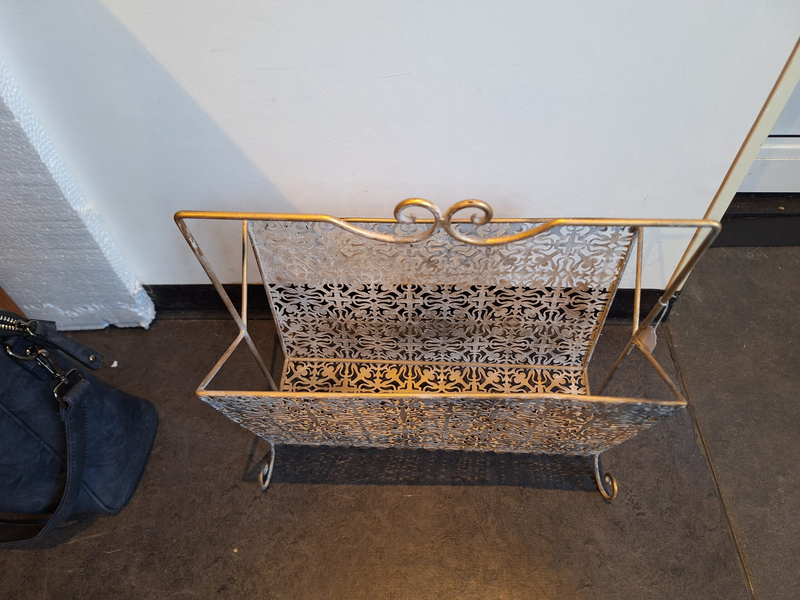 Sierlijke krantenbak van metaal. Hij komt nieuw uit de doos. Afmetingen 42 h 40 b 20 d. Prijs € 22,50